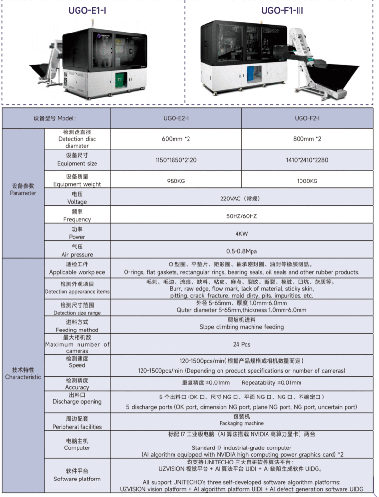 The UGO-FB-II represents the flagship of the double glass disc series, featuring two massive 800mm detection platforms operating simultaneously with an advanced 24-camera vision system. Engineered for the highest-volume rubber seal manufacturing environments, this premium dual-platform architecture delivers unmatched production capacity while maintaining exceptional inspection precision. Integrating UIDI AI deep learning with slope climbing feeding and packaging automation, the UGO-FB-II provides comprehensive defect detection on O-rings, gaskets, and oil seals, making it the ultimate solution for tier-1 automotive and pharmaceutical manufacturers demanding maximum throughput without quality compromise.