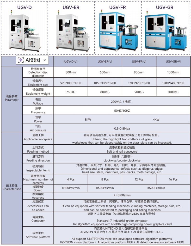 The UNITECHO UGV-GR-VI is the largest and most capable model in the glass turntable series, featuring a massive 1000mm detection disc. Designed for high-volume manufacturing, this system is engineered to inspect workpieces that can be placed stably on a flat surface, such as nuts, washers, stamping parts, and rubber seals. With support for up to 16 high-resolution cameras, a heavy-duty 4KW drive system, and inspection speeds of ±500 pcs/min, the UGV-GR-VI offers unmatched coverage and throughput. Powered by UNITECHO’s self-developed AI ecosystem (UZVISION, UIDI, UIDG), it delivers micron-level accuracy (≥ ±0.002mm) while eliminating blind spots on large or complex flat components.